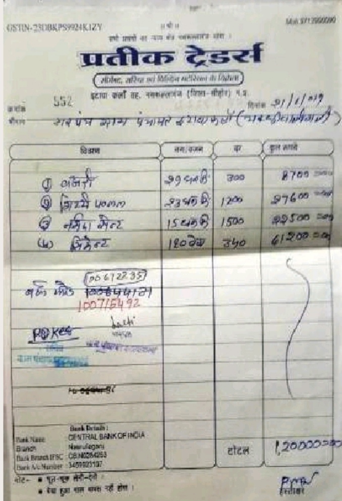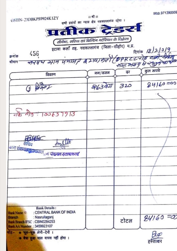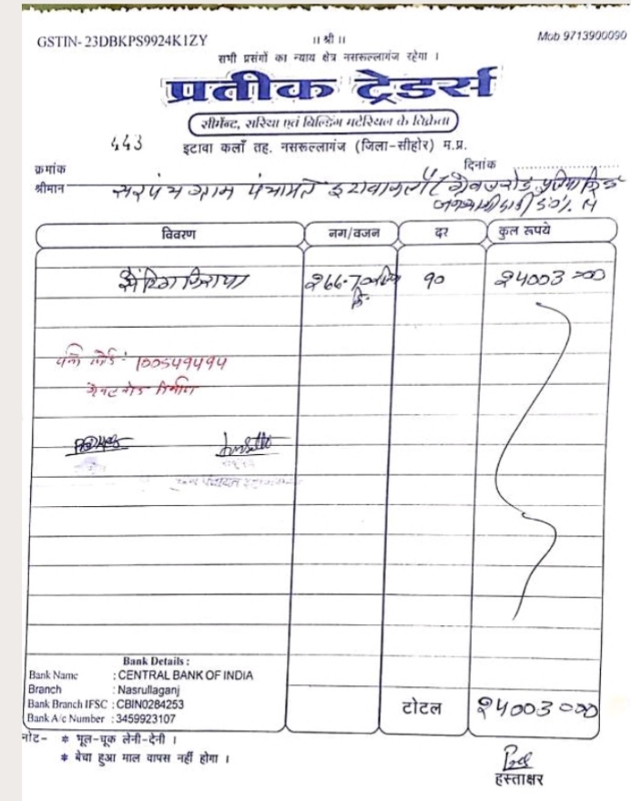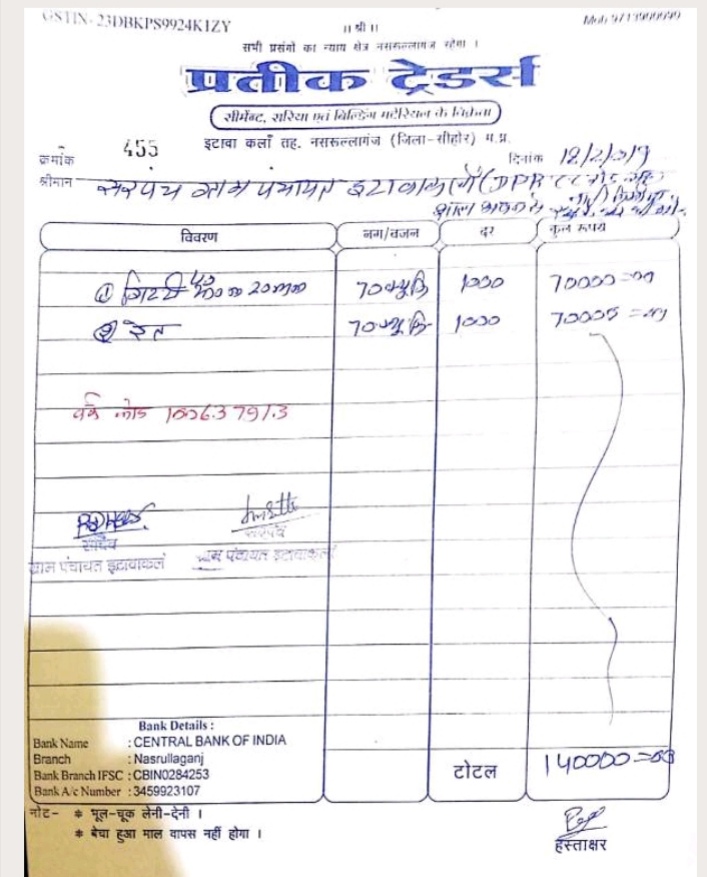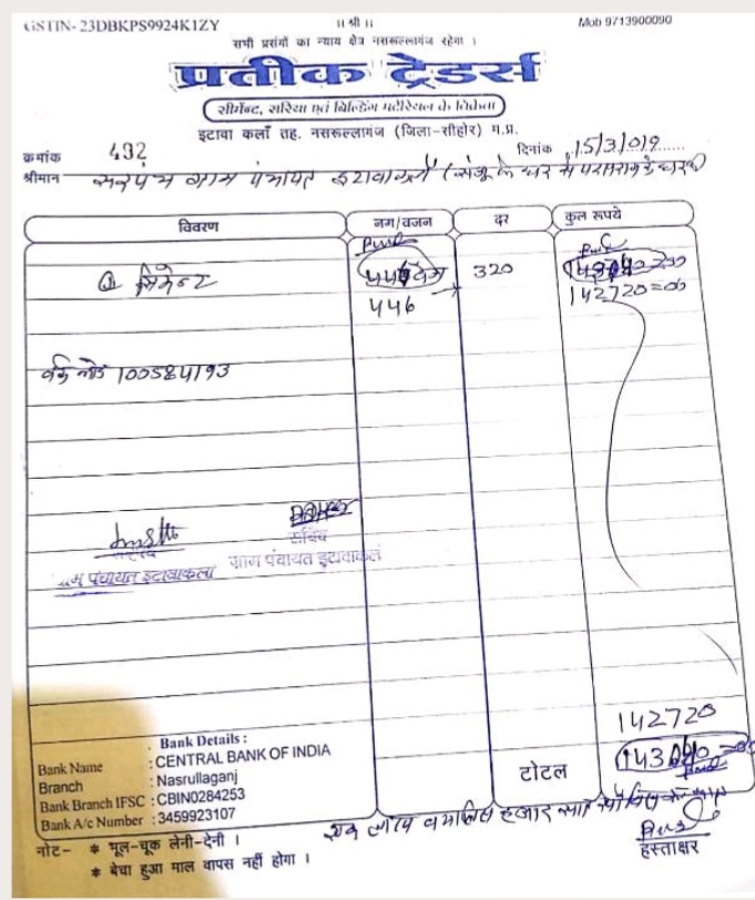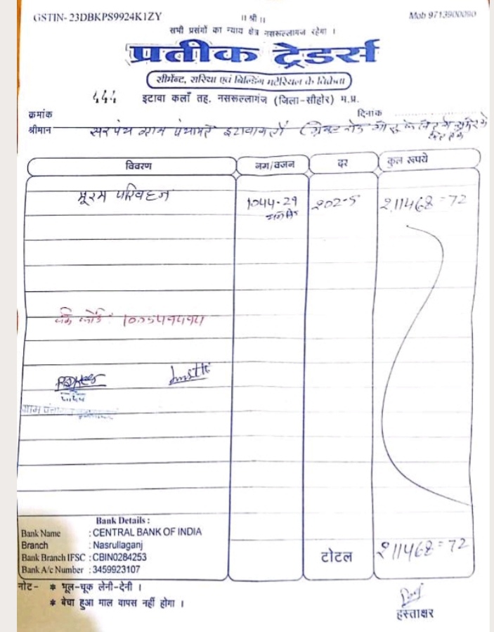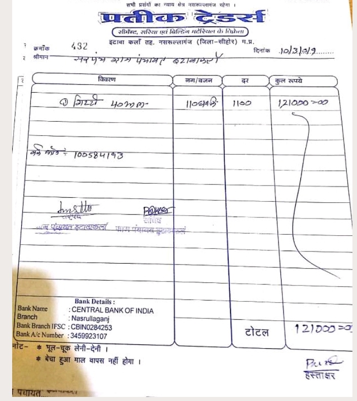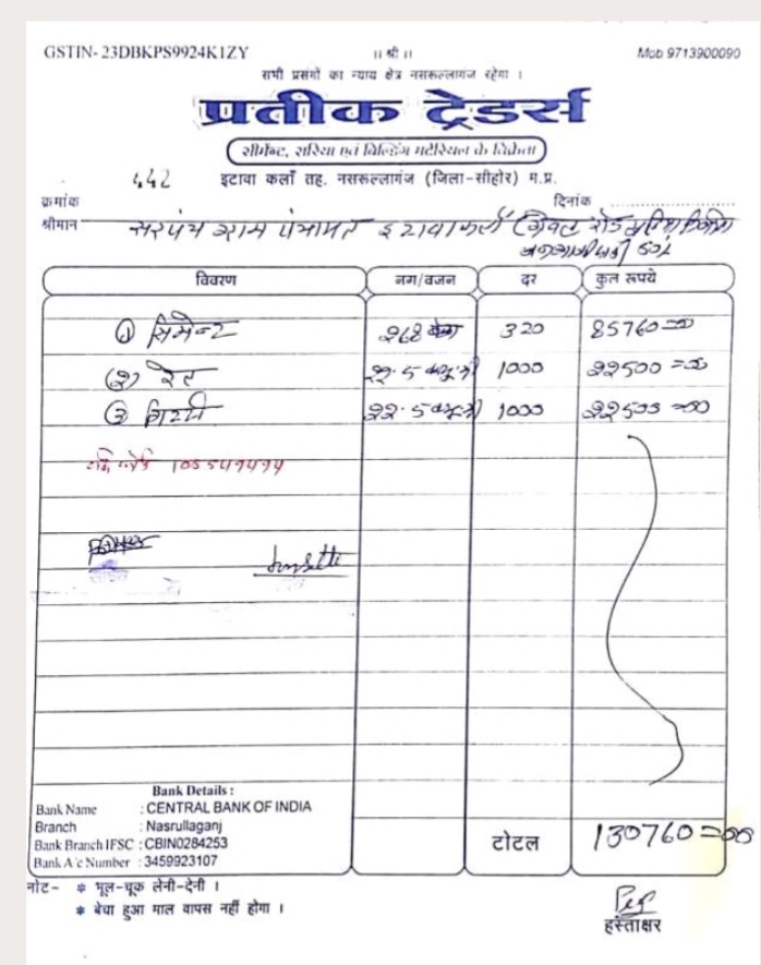 फर्म प्रतीक ट्रेडर्स इटावा कलां के माध्यम से इटावा, सोमलपानी कदीम, बोरखेड़ा कलां, गिल्लोर, राला, कुरी नयापुरा, इटावा खुर्द, रिछारिया कदीम, सीगांव, टिका मोड़, सतराना,घुटवानी, पलासी कलां,चोरसाखेड़ी, बालागांव,सीलखंड,बड़नगर, निभनागांव, इटारसी, कुमनताल, माँजीखेड़ी, नरेला, अम्बजडिड, सुकरवास पंचायतों के निर्माण कार्यों में लगभग 30 करोड़ से अधिक की रेत एवं गिट्टी सप्लाई की गई लेकिन यह रेत गिट्टी इनके द्वारा कहाँ से खरीदी, अगर खरीदी है तो उसका वाणिज्यकर जीएसटी चुकाया ही नही ओर न ही कहीं ऐसे बिल का उल्लेख है जहां से खरीदी गई। अगर खरीदी नही गयी तो इसका सीधा सा अर्थ है कि अवैध खनन किया गया। लेकिन कहीं से प्राप्त जानकारी अनुसार अवैध खनन भी नही किया। इससे सीधे शब्दों में हमारे पाठक समझ सकते है कि प्रतीक ट्रेडर्स के मालिक ने सरपंचों से सांठ गांठ कर कागजी रेत एवं गिट्टी सहित कागजी सीमेंट भी सप्लाई कर गबन में सहभागी रहे।