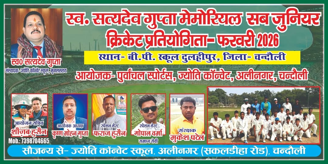 पूर्वांचल स्पोर्ट्स चंदौली और ज्योति कान्वेंट स्कूल अलीनगर मुगलसराय द्वारा आयोजित दूसरी सत्यदेव गुप्त मेमोरियल जूनियर क्रिकेट अंडर 12 का आयोजन 21 फरवरी से बीपी स्कूल दुल्हीपुर मुगलसराय में होगा जिसका पहला मैच दृष्टि एकेडमी बनारस और संजय सिंह एकादश यूपी के बीच होगा… Read More
